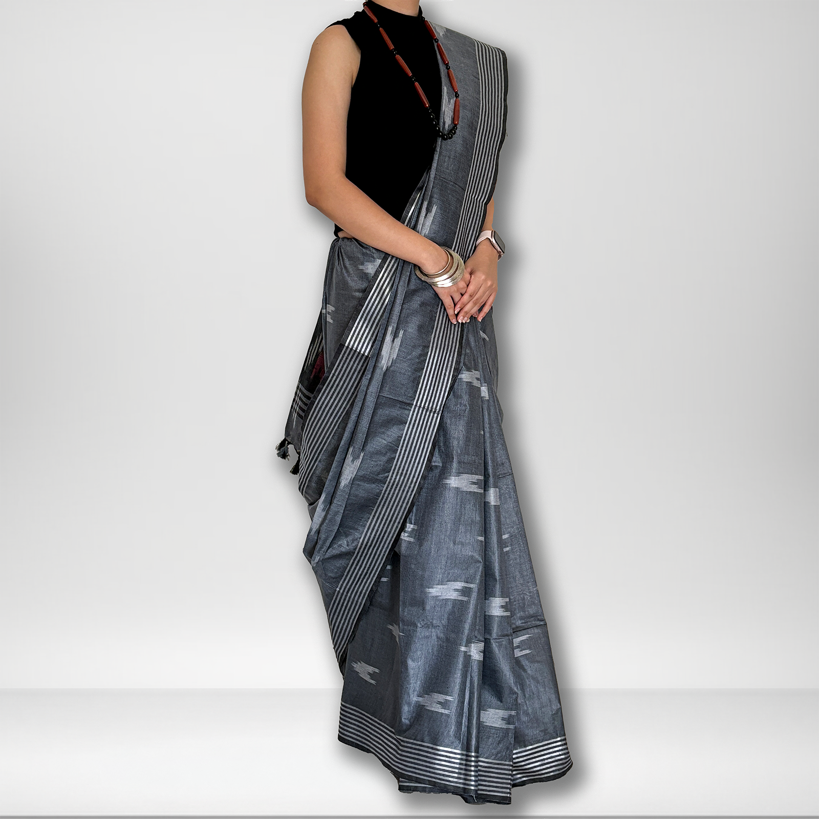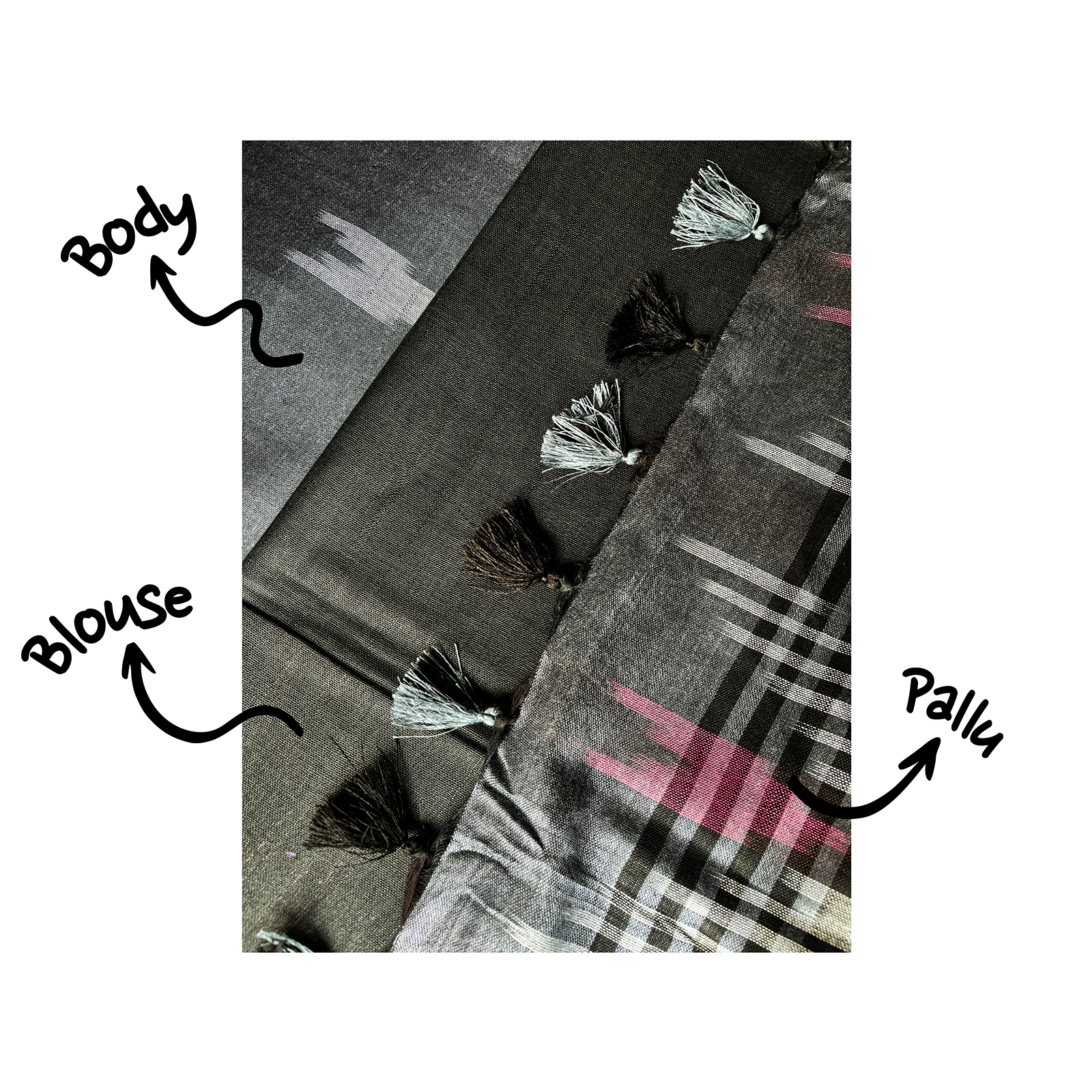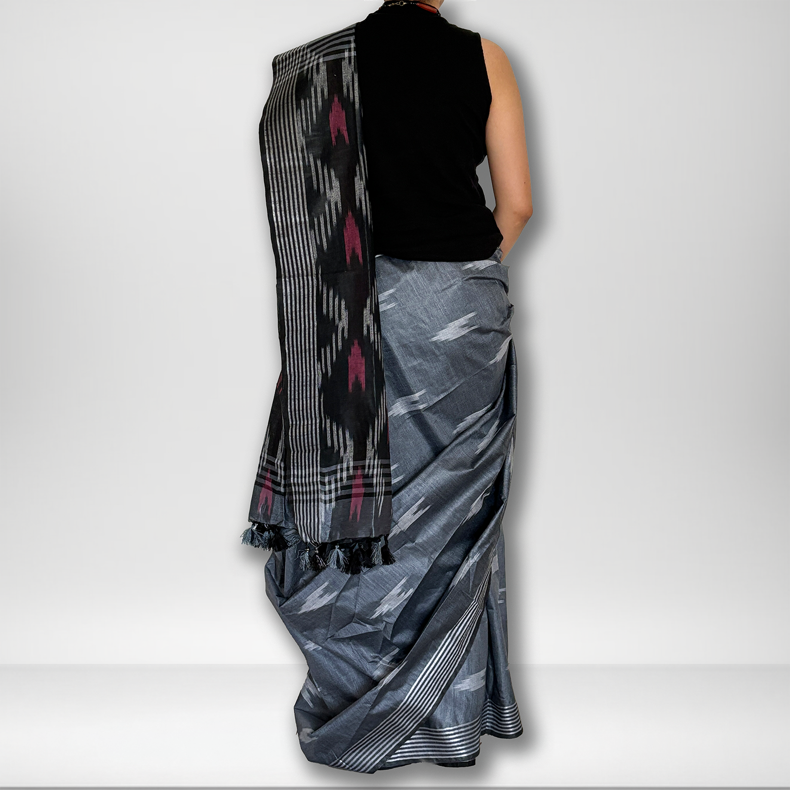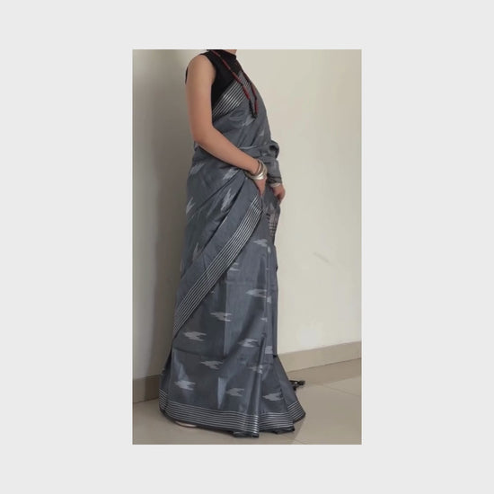 This Ashwini saree is a breathable and stylish choice for any day. The soft cotton linen fabric is comfortable to wear, and the classic Ikat weave adds a touch of texture. The grey and black color palette is sophisticated, while the delicate pink accents add a touch of femininity. This saree is perfect for everyday wear or office attire. Pair it with simple silver jewelry and flats for a polished look.