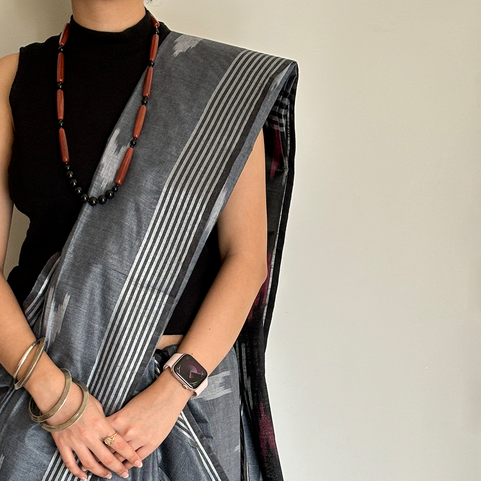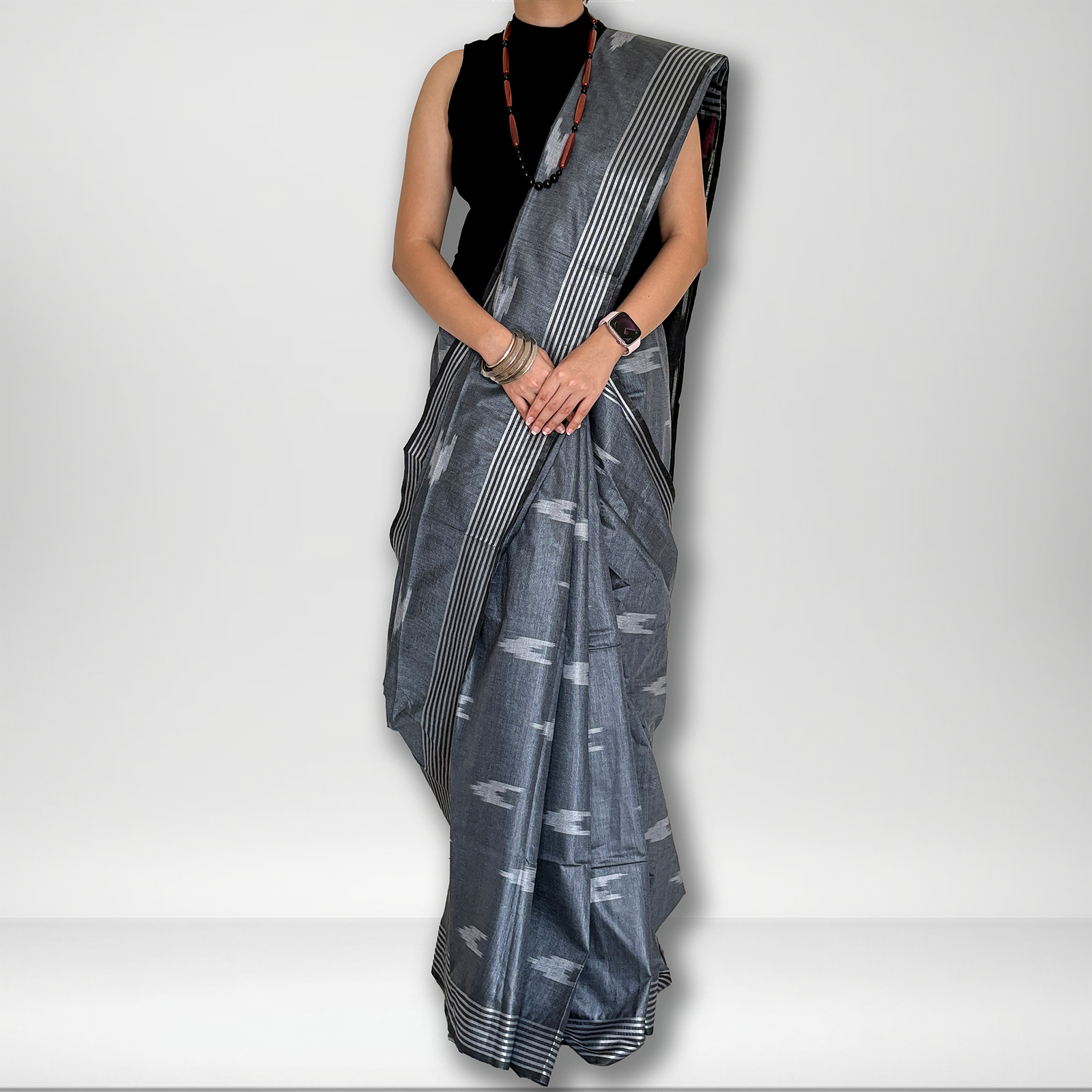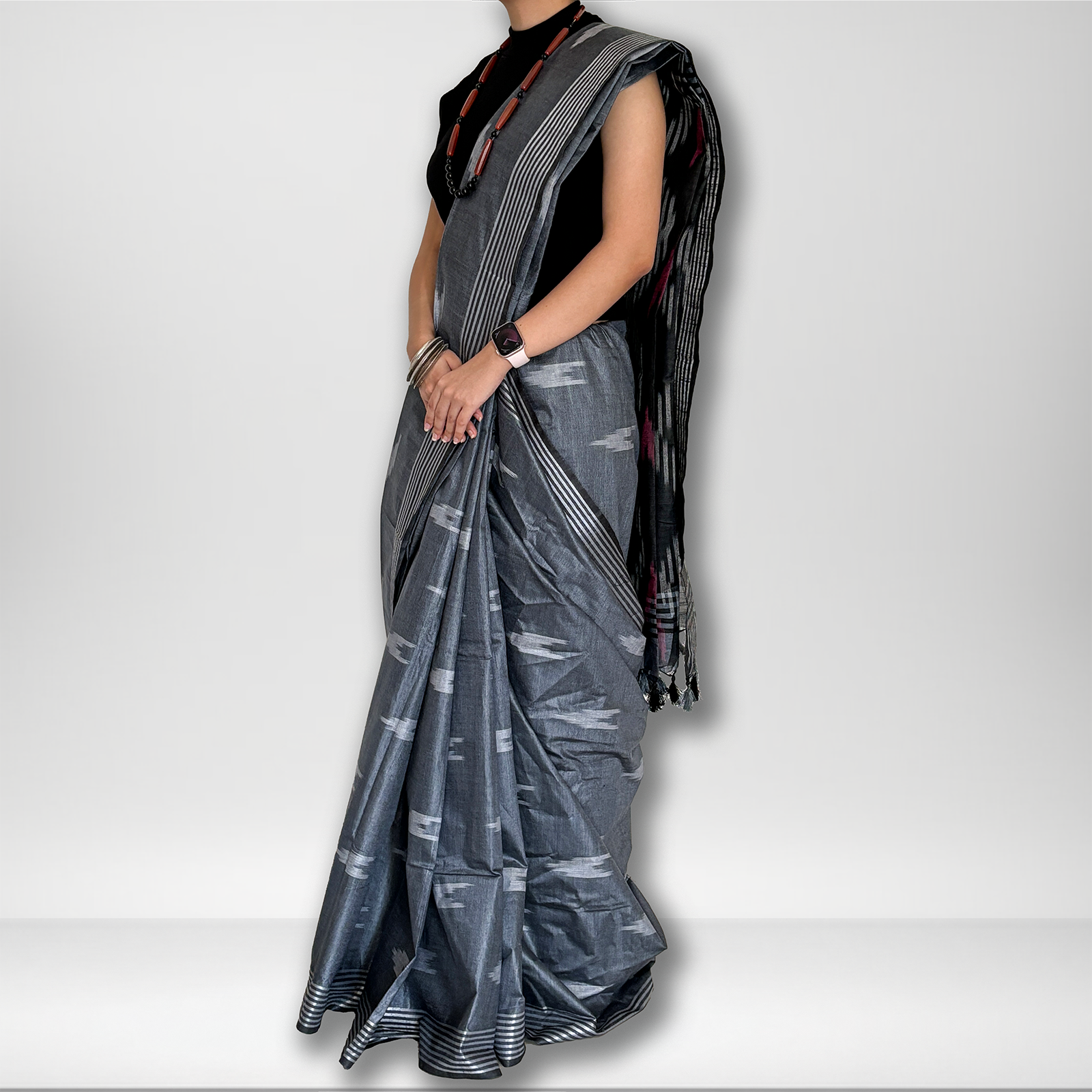 This Ashwini saree is a breathable and stylish choice for any day. The soft cotton linen fabric is comfortable to wear, and the classic Ikat weave adds a touch of texture. The grey and black color palette is sophisticated, while the delicate pink accents add a touch of femininity. This saree is perfect for everyday wear or office attire. Pair it with simple silver jewelry and flats for a polished look.