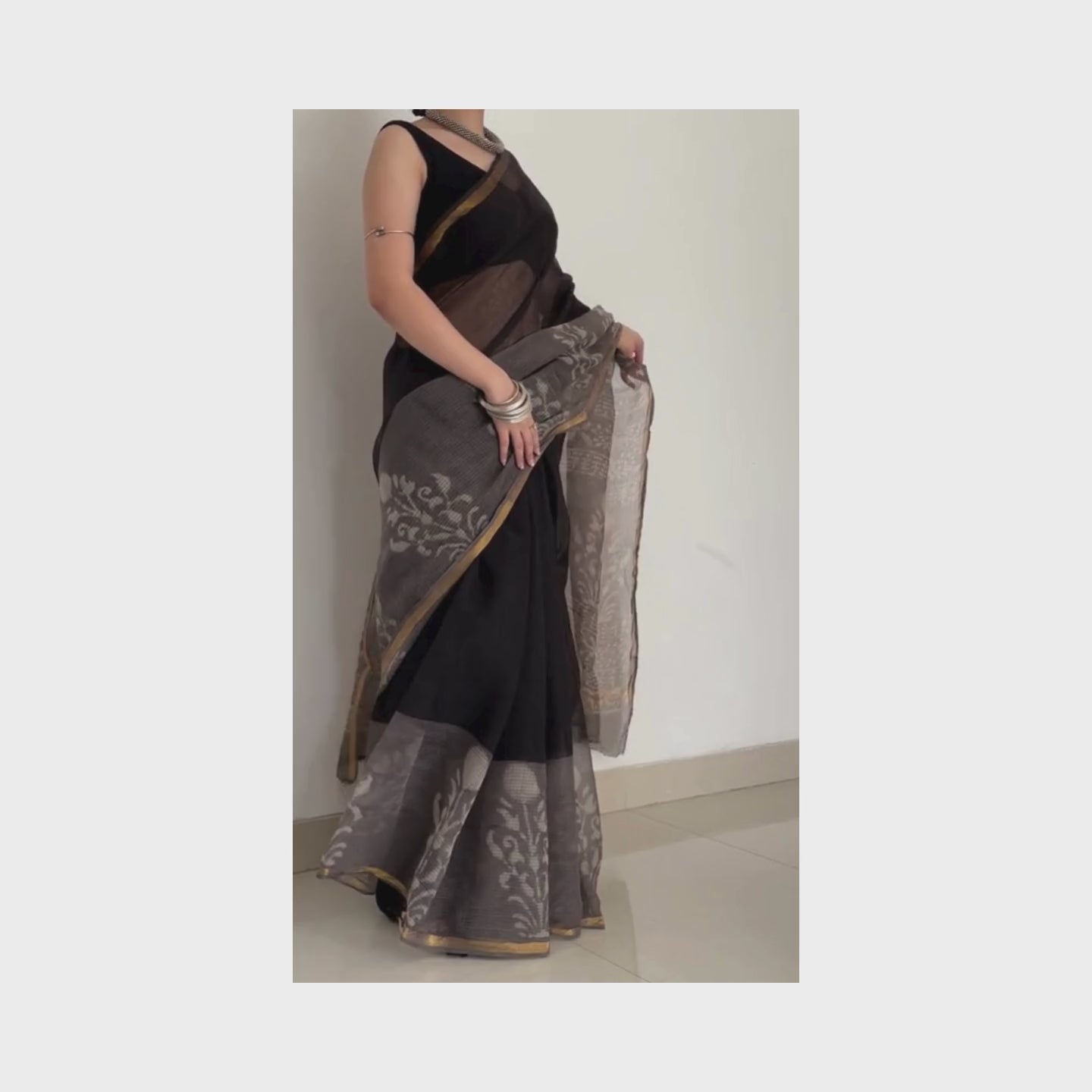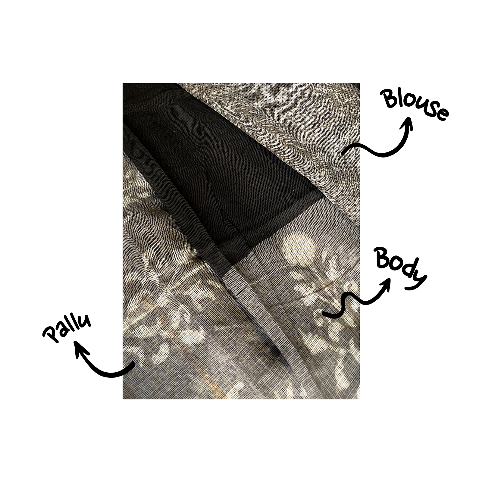 This lightweight Kota Doria saree is perfect for summer days. The classic grey, black and white combination is sharp and sophisticated, while the intricate block prints add a touch of artistry. The airy fabric drapes beautifully and is comfortable for all-day wear. This saree is versatile enough for work or casual outings. Dress it up with heels and statement earrings for a more formal look, or keep it relaxed with flats and a tote bag.
