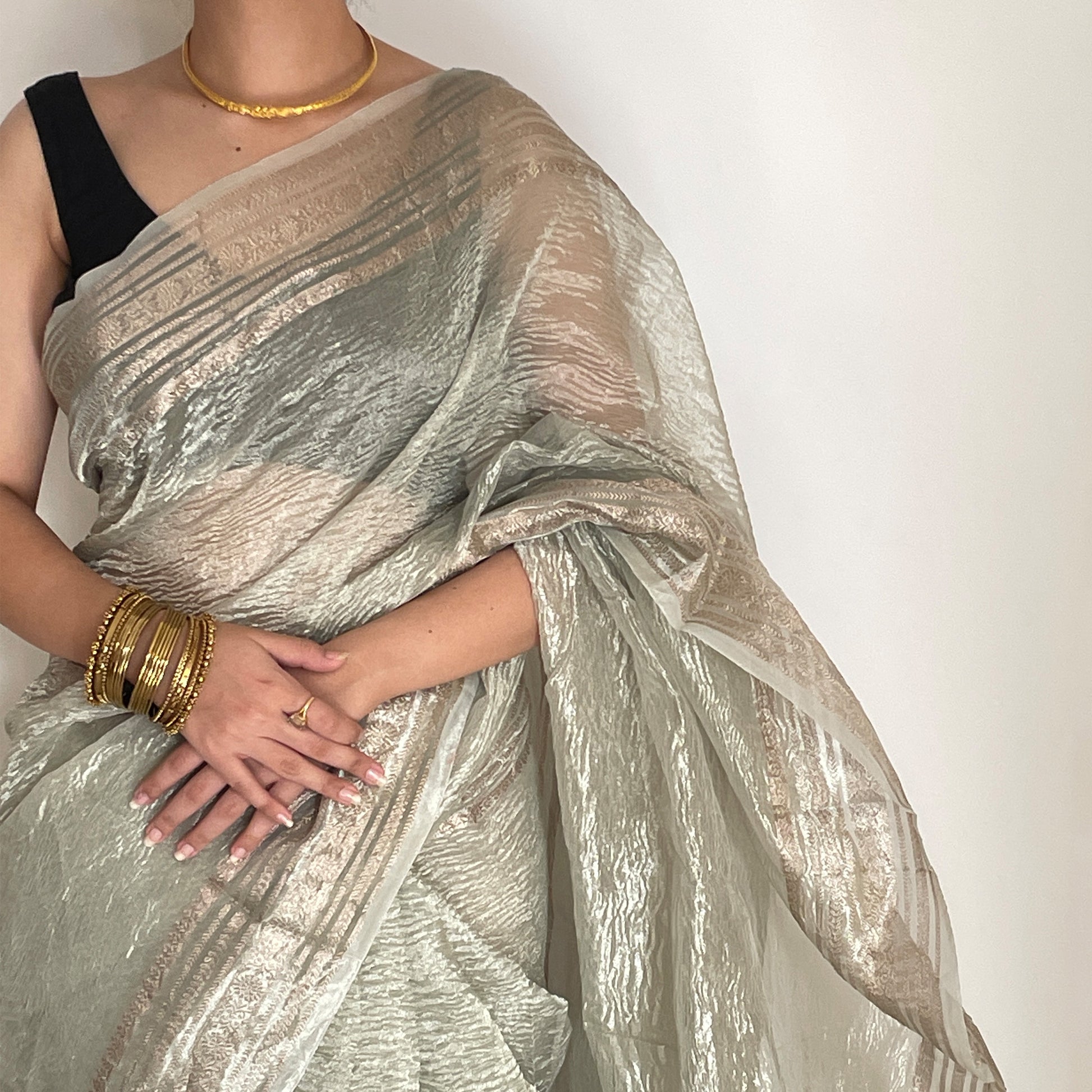 The Kanak saree is a stunning silver sand metallic crush tissue saree with a beautiful copper zari border. The lightweight fabric drapes gracefully, creating a soft and comfortable feel. The metallic crush tissue catches the light, creating a shimmering effect that's perfect for an evening event. The copper zari border adds a touch of sophistication, making this saree ideal for festive occasions or a night out. Style it with a contrasting blouse and statement jewelry to complete the look.