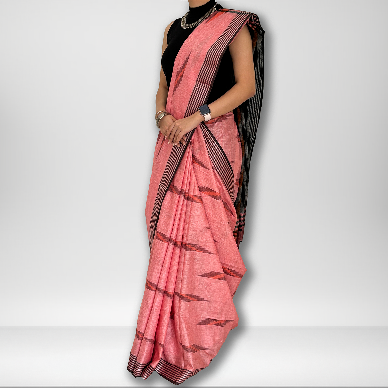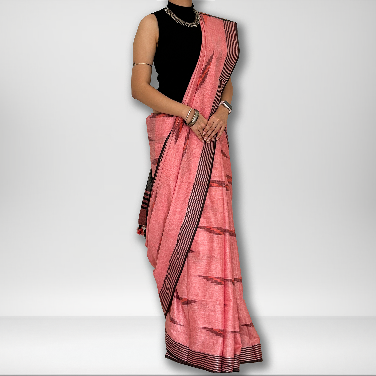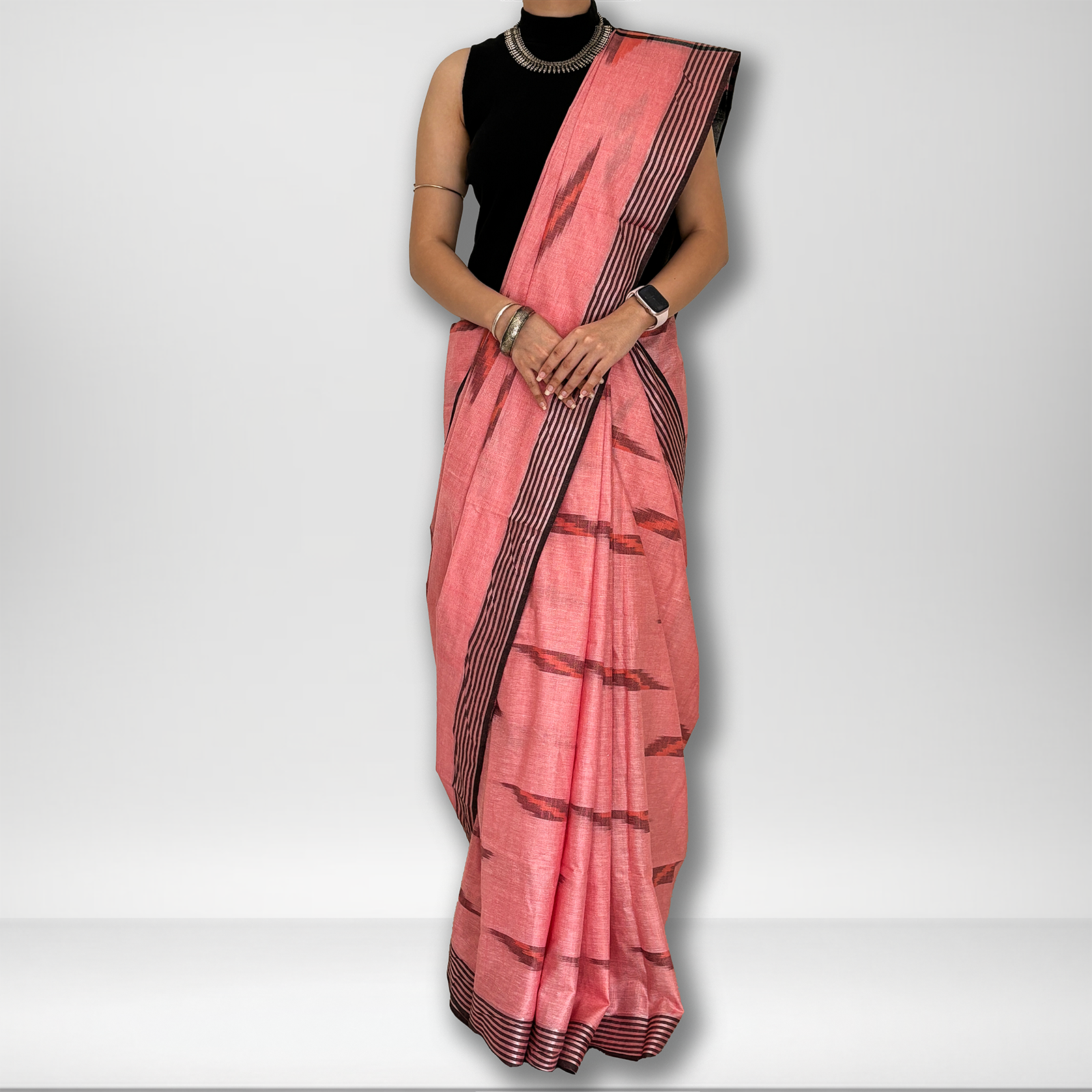 This breezy cotton linen saree by Shobhangini features a stunning Ikat weave in shades of pink and black, accented with pops of red. The soft, breathable fabric drapes beautifully and is perfect for everyday wear or warmer occasions. The eye-catching design makes a statement, while the natural fibers ensure you stay cool and comfortable. Pair it with silver jewelry and sandals for a touch of elegance, or dress it down with flats for a more casual look.