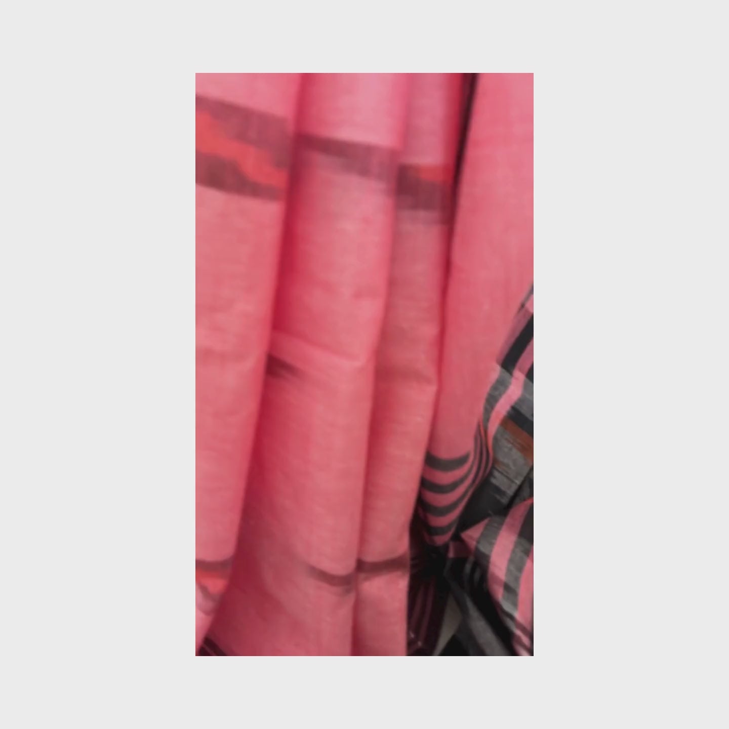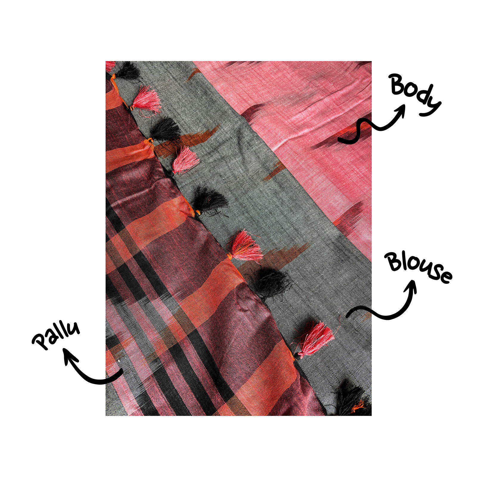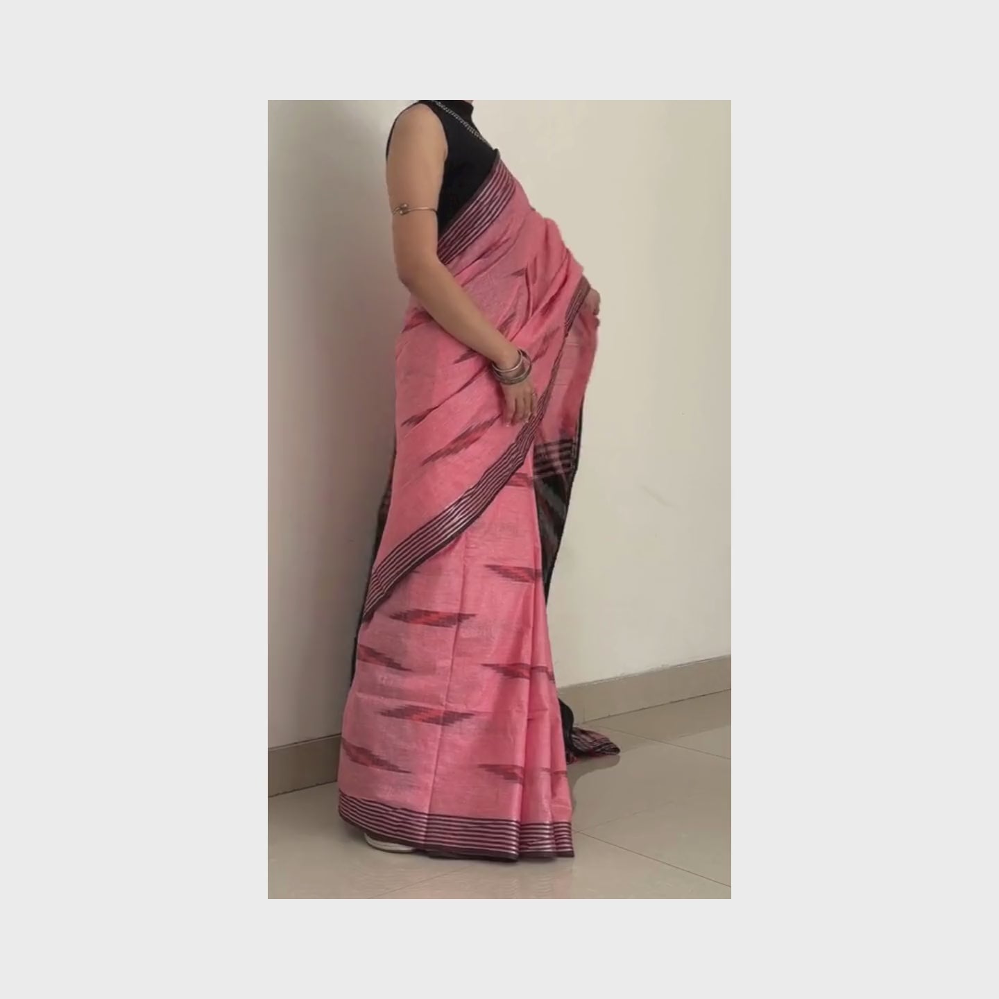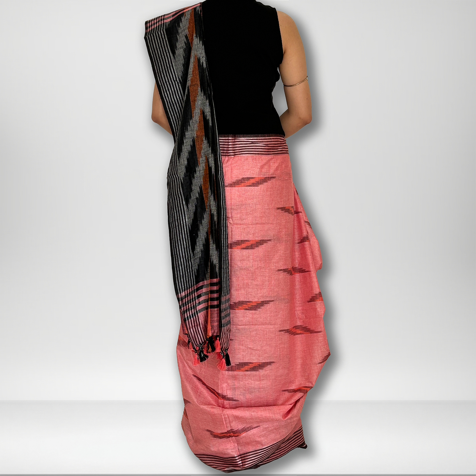 This breezy cotton linen saree by Shobhangini features a stunning Ikat weave in shades of pink and black, accented with pops of red. The soft, breathable fabric drapes beautifully and is perfect for everyday wear or warmer occasions. The eye-catching design makes a statement, while the natural fibers ensure you stay cool and comfortable. Pair it with silver jewelry and sandals for a touch of elegance, or dress it down with flats for a more casual look.