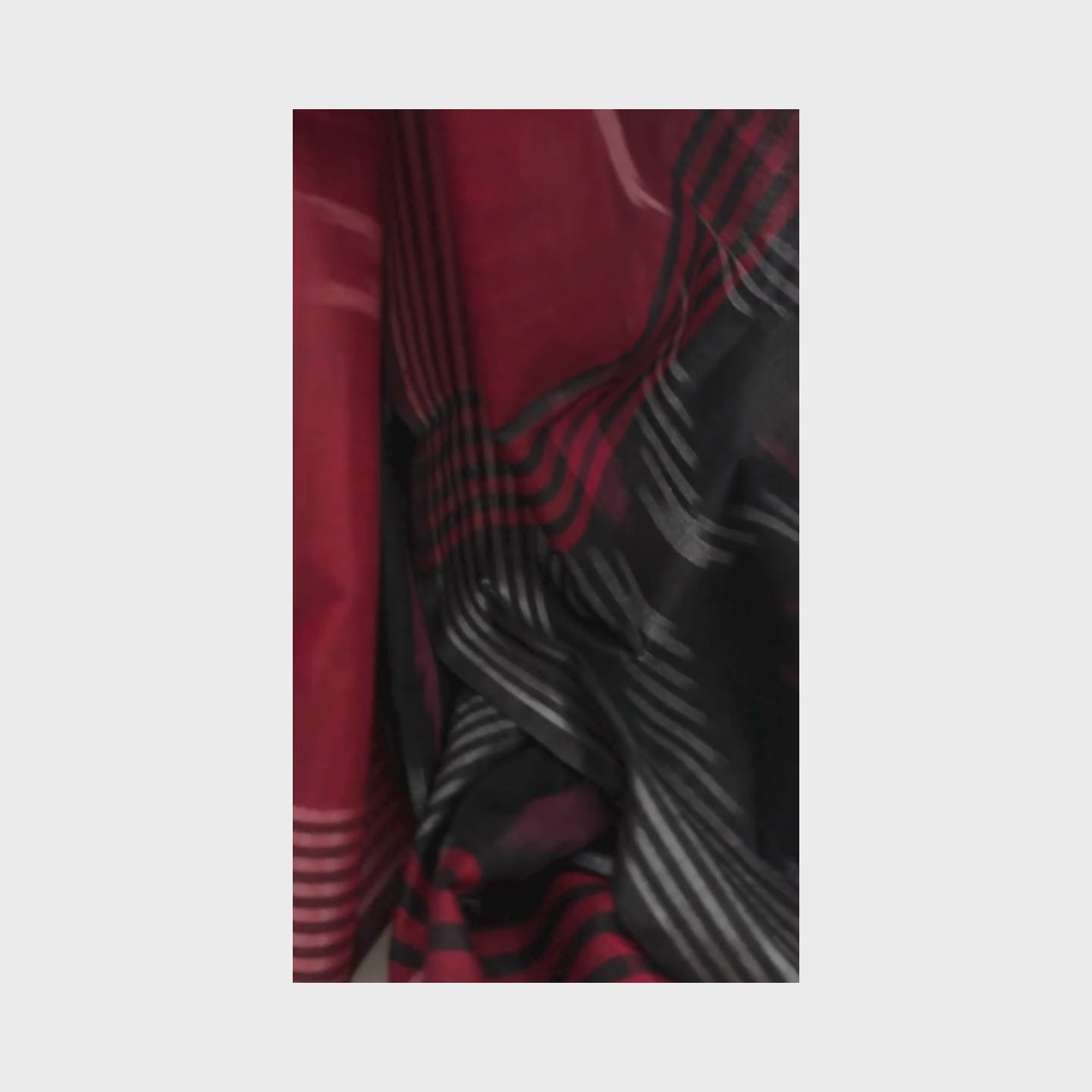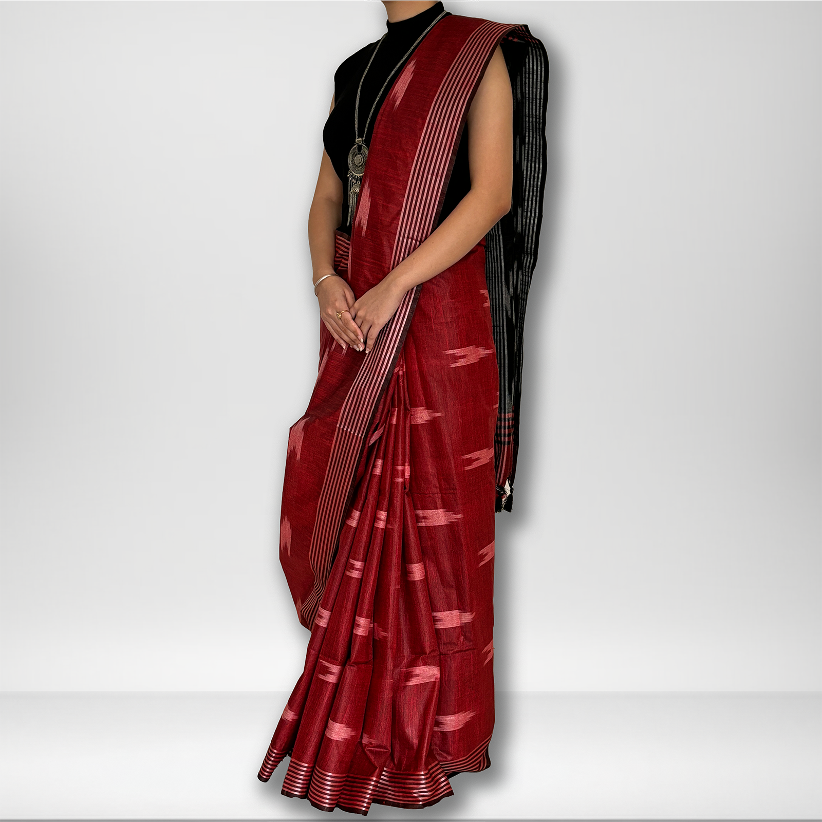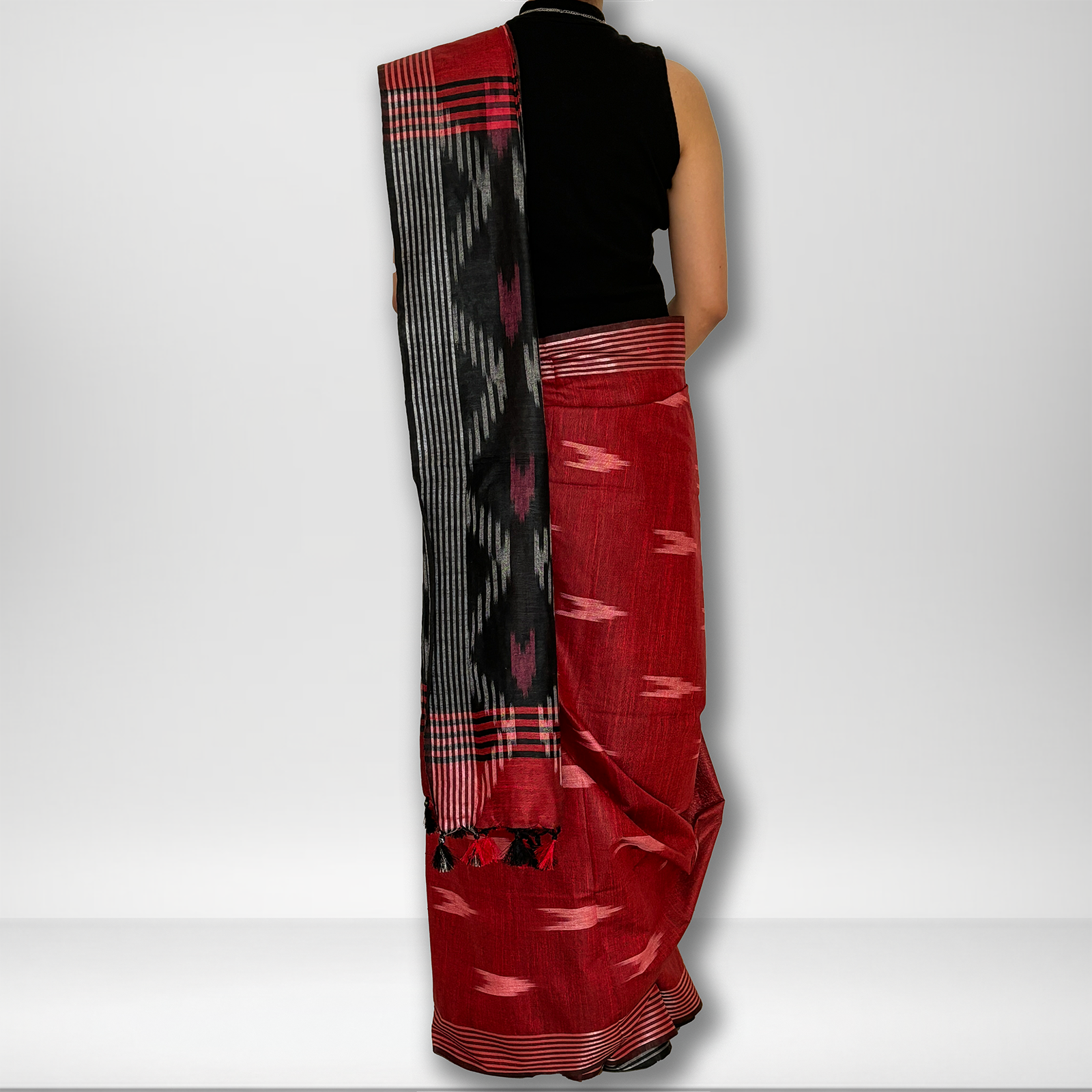 This breathable red and black cotton linen saree features classic Ikat patterns with pops of pink, adding a touch of playfulness to the design. The easy drape of the fabric makes it comfortable to wear for extended periods, perfect for a day out or casual gatherings. Pair it with simple silver jewellery and kolhapuris for a look that's both classic and effortlessly chic.