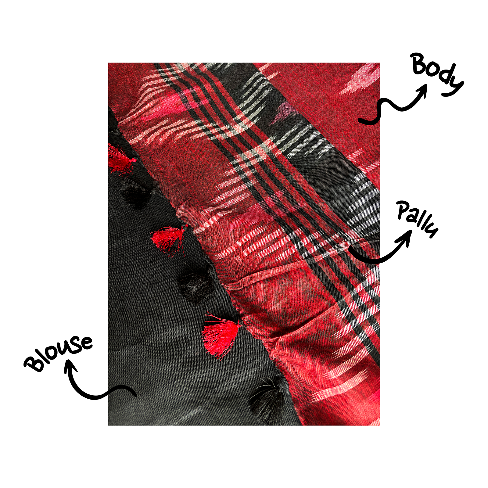 1. Please note that the blouse worn in the images is for styling purposes only. To view the actual blouse fabric that comes with the saree, kindly scroll down to see the image showcasing the fabric of the pallu, body, blouse together.