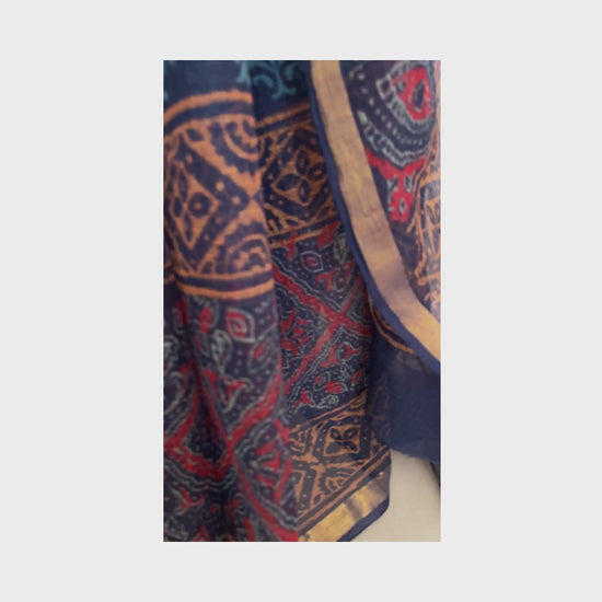 This Rudra saree is a vibrant fusion of tradition and contemporary style. The lightweight Kota Doria cotton drapes beautifully, keeping you cool and comfortable. The eye catching block prints in shades of blue, red, and black add a touch of drama, making this saree perfect for work or an evening out. Pair it with statement silver jewelry to complete your look.