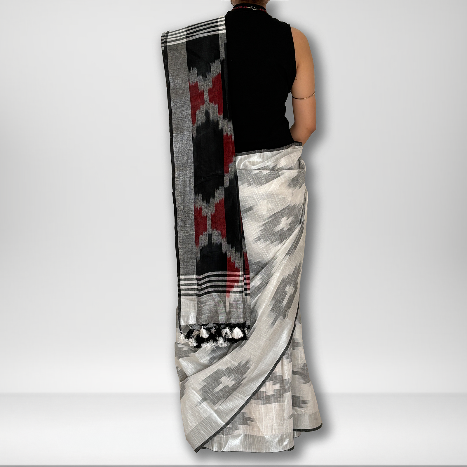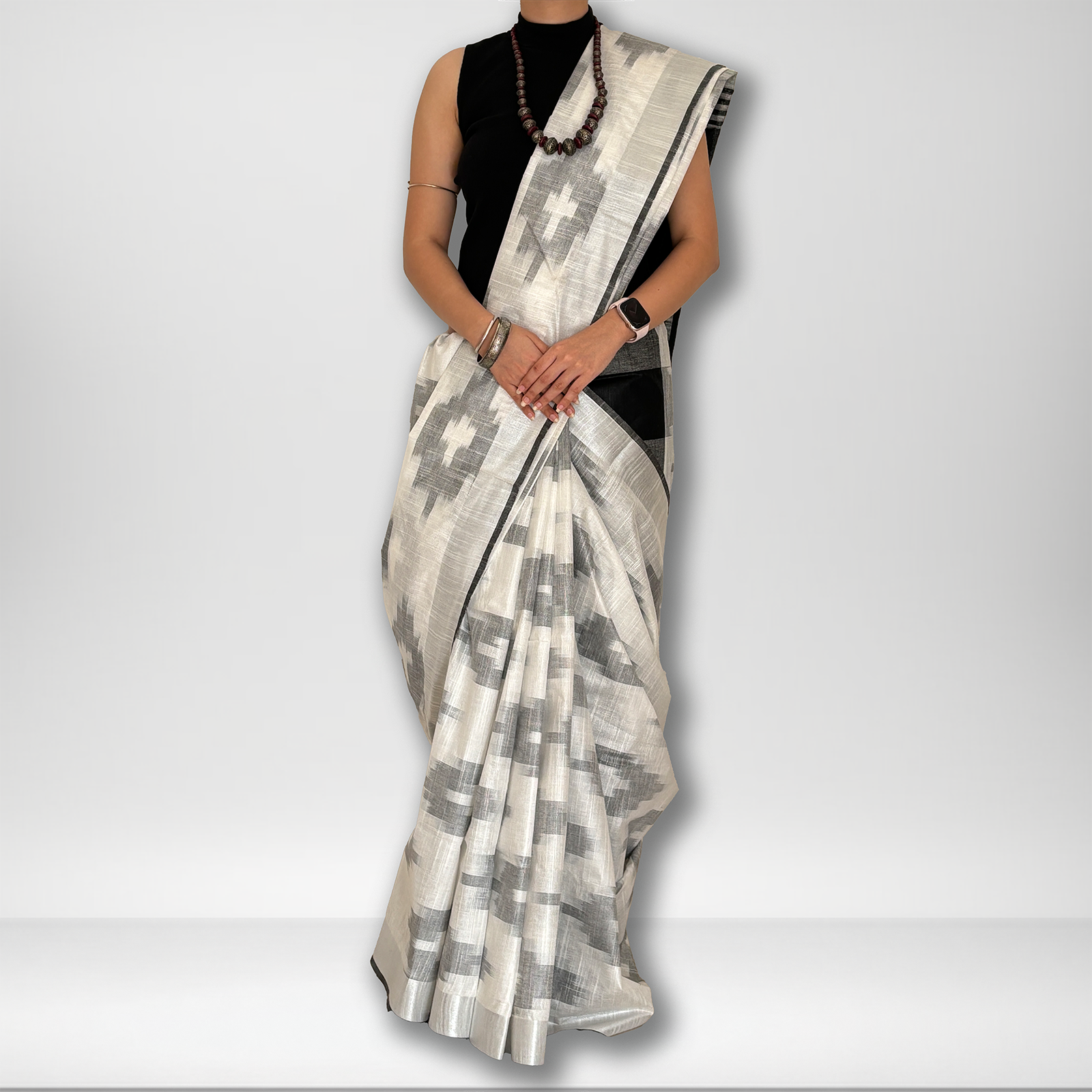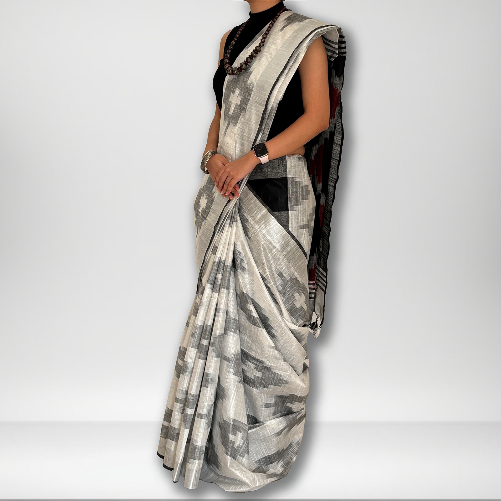 This saree is a breath of fresh air, combining the comfort of soft cotton linen with the eye-catching appeal of classic Ikat weaving. The crisp white base is accented with sophisticated black and grey stripes, while pops of red add a touch of vibrancy. Perfect for work or everyday wear, Vridhi can be dressed up or down depending on your occasion. Pair it with simple jewelry and a fitted blouse for a professional look, or add a statement necklace and sandals for a more casual vibe.