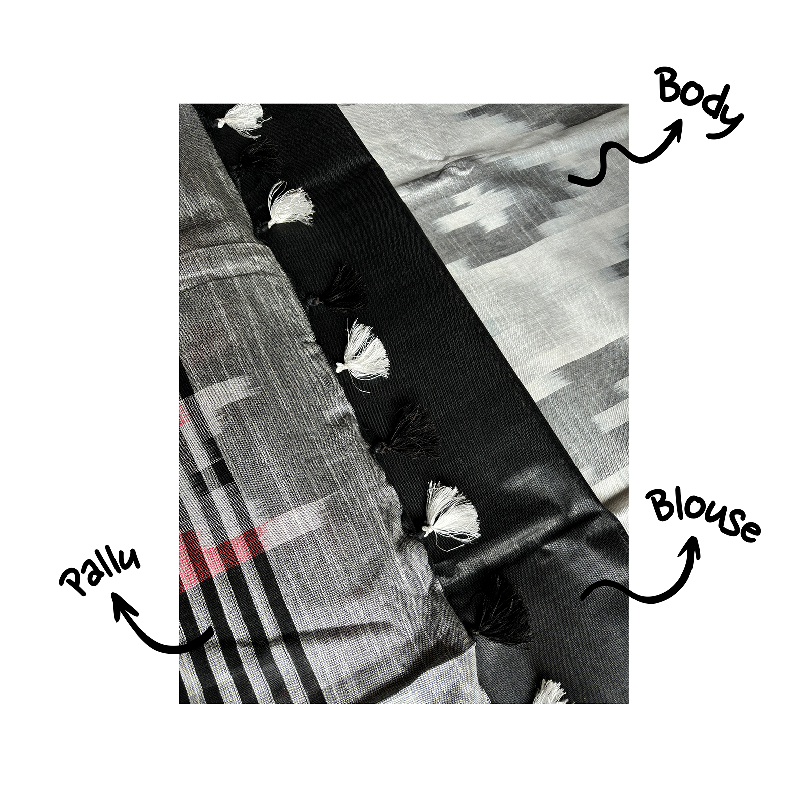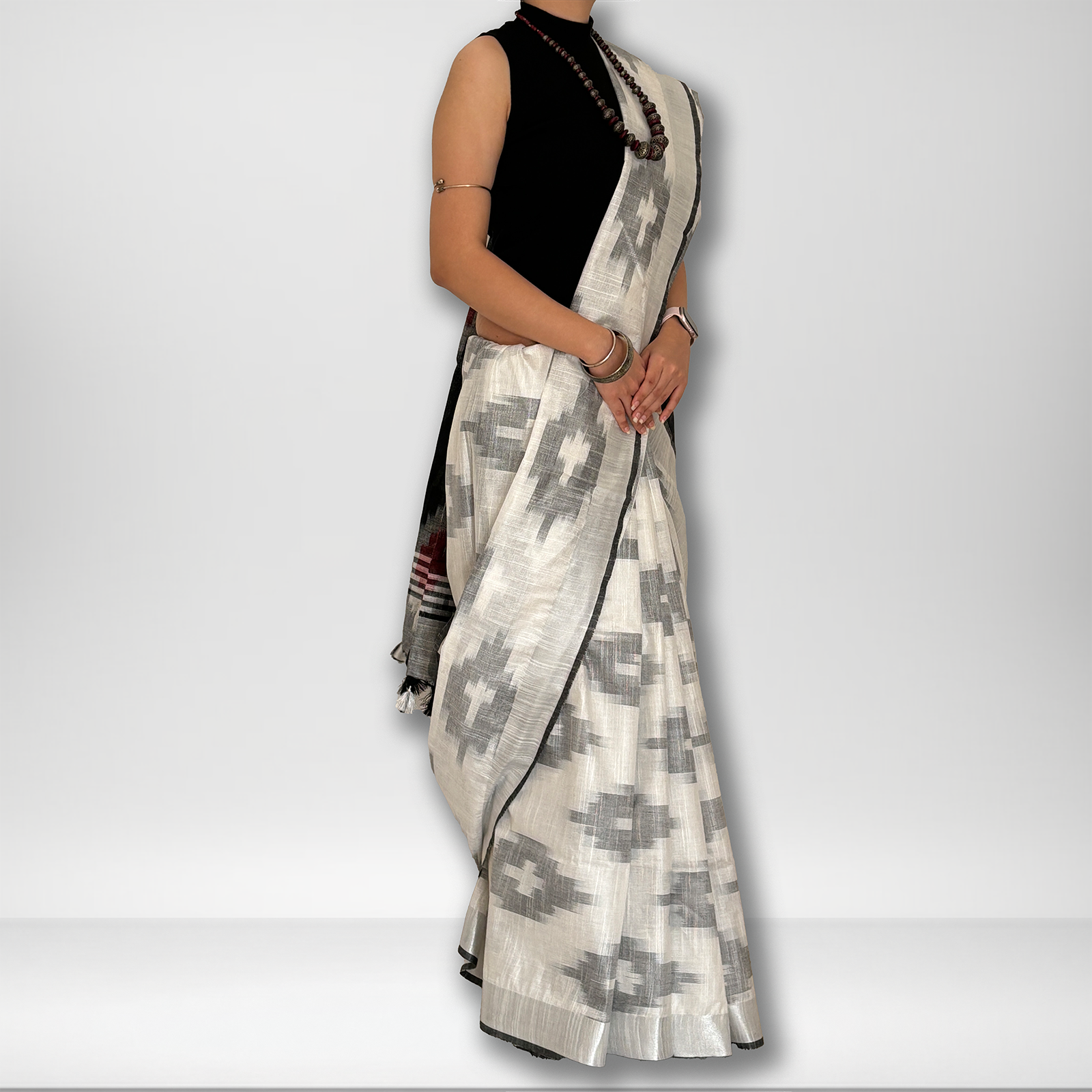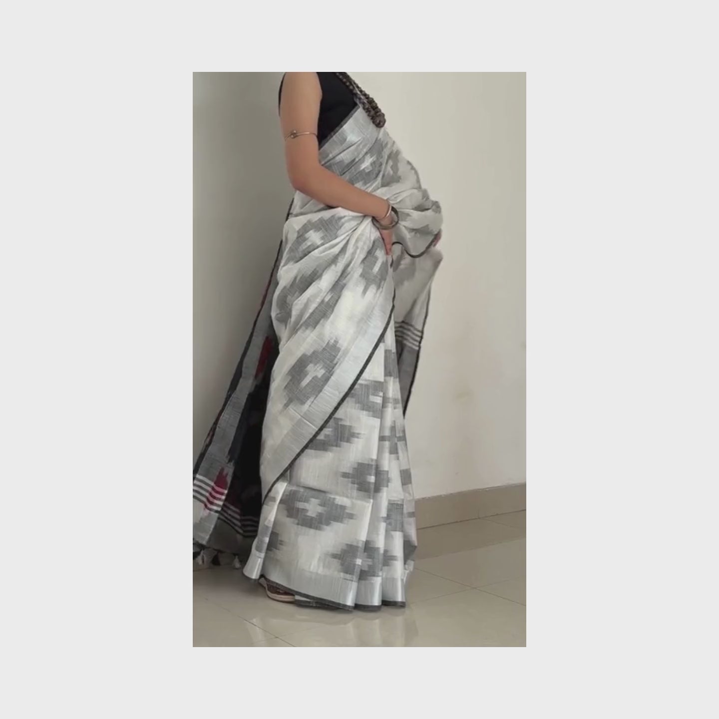 This saree is a breath of fresh air, combining the comfort of soft cotton linen with the eye-catching appeal of classic Ikat weaving. The crisp white base is accented with sophisticated black and grey stripes, while pops of red add a touch of vibrancy. Perfect for work or everyday wear, Vridhi can be dressed up or down depending on your occasion. Pair it with simple jewelry and a fitted blouse for a professional look, or add a statement necklace and sandals for a more casual vibe.